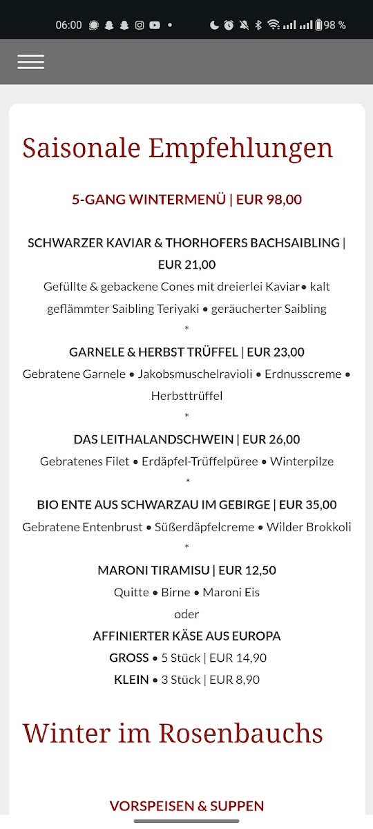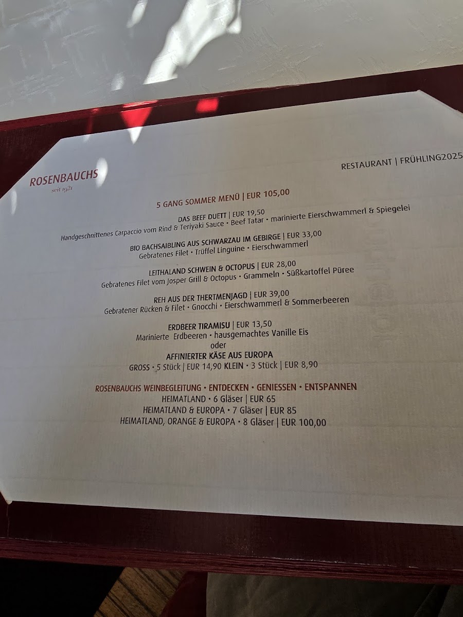 Each dish is carefully crafted with high-quality ingredients, making the menu at Rosenbauchs a perfect destination for a memorable dining experience. Whether you're in the mood for an elegant seafood starter or a rich, satisfying main course, the variety and quality of the offerings ensure there’s something for everyone.